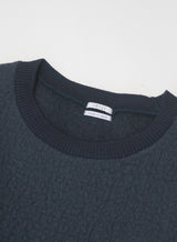 綿とウールの縮率差を活かした縮絨加工を施した独特な生地。表には丈夫でハリのあるコットン、裏には保温性に優れたウールを使用し、軽さと暖かさを両立しました。シンプルながらも存在感があり、カジュアルにもきれいめにも合わせやすい一着です。生地に特徴があるのでデザインはシンプルなクルーネックに。