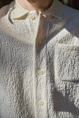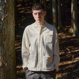 綿とウールの縮率差を活かした縮絨加工を施した独特な生地。表には丈夫でハリのあるコットン、裏には保温性に優れたウールを使用し、軽さと暖かさを両立しました。シンプルながらも存在感があり、カジュアルにもきれいめにも合わせやすい一着です。定番のワークジャケット型は、シーズンを通して長く使えるアイテムです。