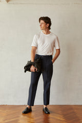 生地の風合いを生かすためシンプルなデザインに。裾をリブにし、スラックスなどにも合せやすい上品なシルエット。