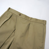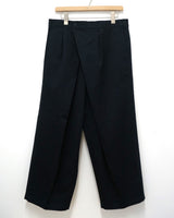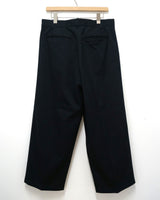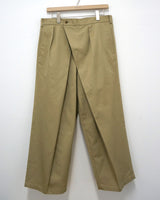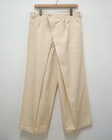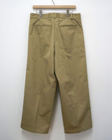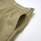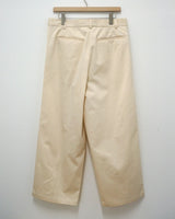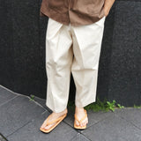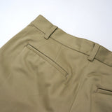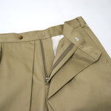 袴を洋装化したモダンなパンツです。前面は深めのタックをとることでボリュームを持たせ、背面はベーシックな仕様にすることですっきりと履きやすいデザインに。足元に様々なシューズを合わせやすい九分丈で、夏場には雪駄やサンダルを合わせることができます。上品な光沢があるコットンチノは履きこむごとに馴染みます。